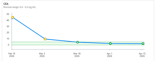 - And the reason my oncologist was confident enough to make the “remission” call is that my CEA continues to drop! I had full expectations that the drop wouldn’t be linear; small bumps can happen and are still not considered bad, as sometimes more CEA is released into the blood as cancer cells are dying. But to recap and update, mine started at 45.2, then the dramatic drop down to 9.7, then 4.6, and my last update was 2.4; in the NORMAL range. So again, expecting a possible rise this week, we were all shocked to see it at 2.1! It’s stabilizing, which is what caused the clinical term remission this week.